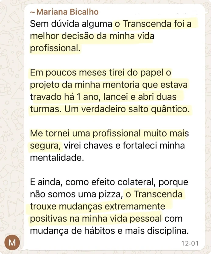 As duas últimas turmas do Transcenda, no formato de mentoria, custaram R$25.000,00. Mas para impactar mais pessoas, eu decidi que você não vai pagar 25 mil reais dessa vez. Nem mesmo 12 mil.